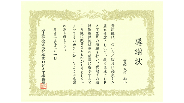 2016年熊本地震におけるDPAT活動について感謝状をいただきました。